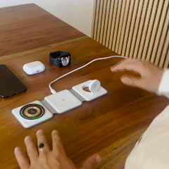 Vergiss das Kabelwirrwarr auf Reisen! Mit deinem A`DAR ADA 3-in-1 kannst du iPhone, Samsung, Apple Watch, AirPods und alle Qi-fähigen Geräte ganz einfach aufladen.